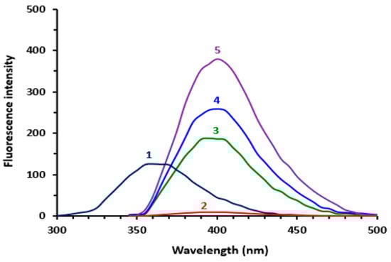 The emission spectra of blank plasma sample (contains no DUV) after excitation at 275 nm (1), blank plasma sample (contains no DUV) after excitation at 340 nm (2), plasma sample spiked with DUV at concentrations of 100, 450 and 600 ng/mL (3, 4 and 5, respectively) after excitation at 340 nm.