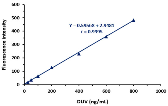 Under the optimum conditions of the method (Table 1), the calibration graph for the determination of DUV was generated by plotting the fluorescence intensity as a function of the corresponding DUV concentrations (Figure 6). The regression analysis for the results was conducted. The linear equation was Y = 0.5956X + 2.9481, where Y is the fluorescence intensity at 405 nm (after excitation at 340 nm) and X is the concentration of DUV in ng/mL in the range of 25–800 ng/mL. The correlation coefficient (r) was 0.9995. A summary of the statistical parameters is given in Table 2.