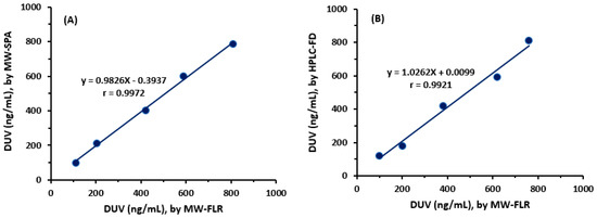 To compare the proposed MW-FLR with pre-validated reference methods, samples from copiktra capsules having varying DUV concentrations (100–800 ng/mL) and plasma samples spiked with the same concentrations of DUV were analyzed by the proposed MW-FLR method and reference methods. The reference methods were microwell-spectrophotometric assay (MW-SPA) [17] and HPLC with fluorescence detection (HPLC-FD) [21] for analysis of copiktra capsules and plasma samples, respectively. The values obtained by both MW-FLR, and reference methods were correlated very well with each other (Figure 7). The regression analysis of the results showed a good agreement between the results obtained by the two methods, as evident from the obtained good correlation coefficients (Figure 7). This indicated the validity of the proposed MW-FLR for the accurate determination of DUV in copiktra capsules and plasma samples.