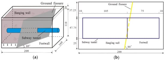 Yuan et al. [14,15] performed a dynamic model test for the scenario that the ground fissure was orthogonal to the horseshoe-shaped tunnel, and analyzed the mutual influence of subway tunnels, stratum, and ground fissures under the action of traffic load. The model results helped reveal the dynamic response of monolithic and segmented tunnels under the complied action of active ground fissures and traffic loads. Yang et al. [16,17] established a tunnel–ground fissure–stratum interaction model with different lining types to investigate the basic characteristics of soil vibration adjacent to the ground fissure, and the influence of the size and shape of the tunnel section on the vibration response. Yang et al. [18] analyzed the dynamic response among the ground fissure, subway tunnel, and surrounding rock under subway vibration load through the physical model test under the condition that the ground fissure and the shield tunnel were orthogonal. Although these studies focused on the interaction between ground fissures and the dynamic response of subway tunnel via model test, very few works have been conducted on the dynamic effect of traffic loading on the subway tunnel with the impact of ground fissures, especially for the scenario that the ground fissure is obliquely intersected with a subway tunnel.