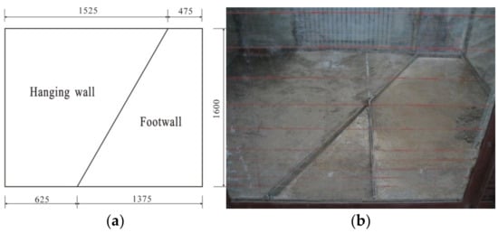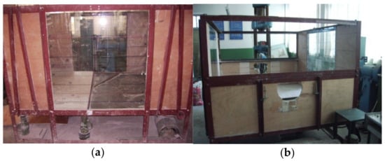 The model test in this study was performed in a model box, as shown in Figure 2 and Figure 3. The maximum allowable model size is 2.0 m (length) × 1.6 m (width) × 1.2 m (height), and the modeled tunnel obliquely crossed the ground fissure at an angle of 60°. The bottom plate of the model box was divided into 2 pieces and 5 lifting jacks were installed at the bottom plate of the hanging wall to simulate its settlement. Additionally, in order to reduce the friction between the soil layer and the model wall, two layers of polystyrene plastic film were laid on the inner wall of the model box, and talcum powder was spread between the two layers of plastic film.