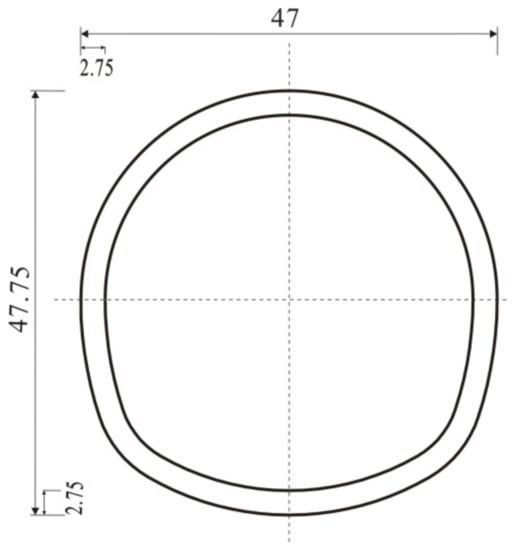 The model tunnel was designed to be 47.75 cm high, 47 cm wide, and 2.75 cm thick, according to the similar relationship with the prototype. The concrete C15 was selected for the model with an overall length of 1.8 m. Furthermore, 38 Φ2 steel bars were set in the longitudinal direction with a spacing of 40 mm, and 86 Φ2 steel bars were set in the transverse direction with a spacing of 20 mm. The detailed information about the tunnel cross-section is presented in Figure 4.