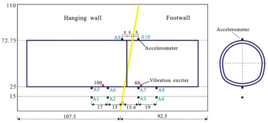 Taking into account the variation of the train position during the movement process, 2 vibration exciters were set inside the tunnel at a distance of 60 cm and 100 cm from the right margin (Figure 5) of the tunnel.