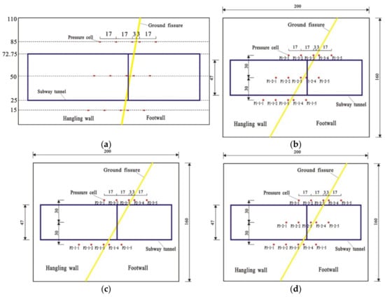 In order to measure the variation of the contact pressure between the soil and the tunnel, two circles of ZFCY180 earth pressure cells (8 cells in each circle) were installed in the tunnel on both sides of the ground fissure, as shown in Figure 7.