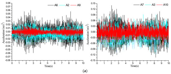 The results from test points of A3, A7, and A10 in the hanging wall, and A2, A6, and A9 in the footwall were analyzed to investigate the dynamic response at different embedded depth. Figure 8 and Figure 9 show the acceleration time series and the peak acceleration curve at test points under 10 Hz excitation at 60 and 100 cm from the right margin of the tunnel. When the vibration exciter at 60 cm works, the peak acceleration at points A6 and A7 (0.06 and 0.13 m/s2, respectively) is obviously higher than that at A2 and A3 (0.04 and 0.11 m/s2, respectively), indicating the attenuation effect of the soil layer on the subway-induced vibration. Meanwhile, peak acceleration at points A9 and A10 at the tunnel crown is quite low in such a condition, with values of 0.02 and 0.08 m/s2, respectively. When the vibration exciter at 100 cm works, the test results show a similar variation as the test points at the tunnel bottom, which show the largest peak acceleration, and the points at the tunnel crown and 10 cm below the tunnel bottom, which show the decreasing peak acceleration. In general, the soil acceleration attenuates both upward and downward from the vibration exciter with the maximum value at the tunnel bottom.