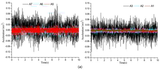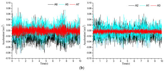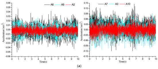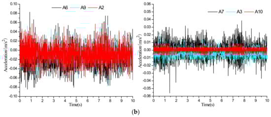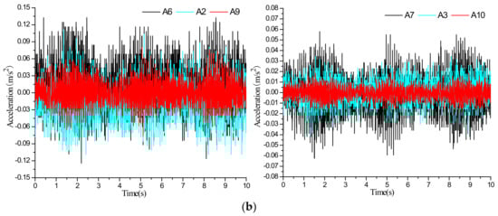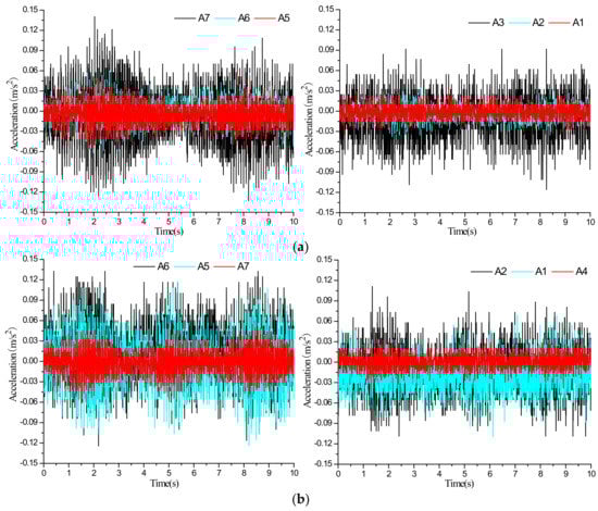 Acceleration time series of the two-section subway tunnel under the scenario of inactive ground fissure: (a) vibration exciter at 60 cm; (b) vibration exciter at 100 cm.