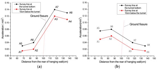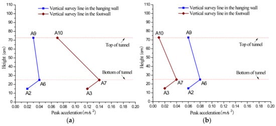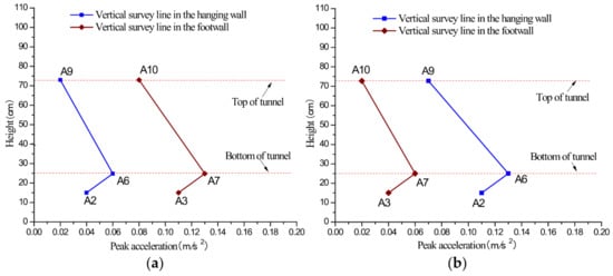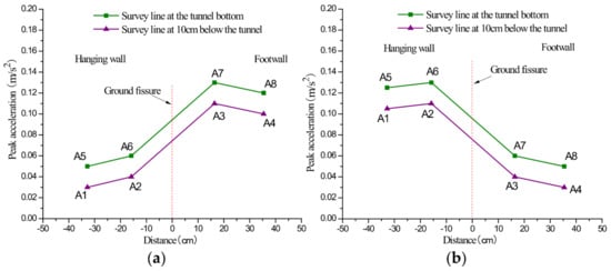 Peak acceleration curves under the scenario of hanging wall descend 1 cm: (a) vibration exciter at 60 cm; (b) vibration exciter at 100 cm.