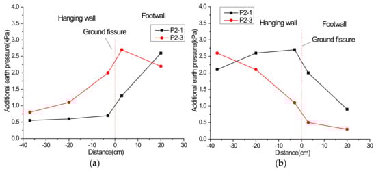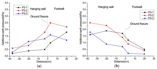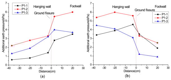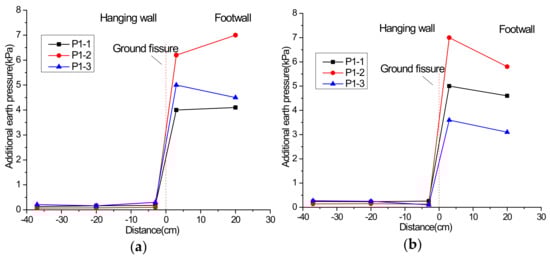 Additional earth pressure at 15 cm height under the scenario of inactive ground fissure: (a) vibration exciter at 60 cm; (b) vibration exciter at 100 cm.