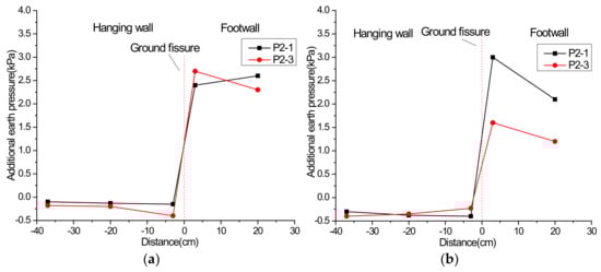 Additional earth pressure at 50 cm height under the scenario of hanging wall descending (1 cm): (a) vibration exciter at 60 cm; (b) vibration exciter at 100 cm.