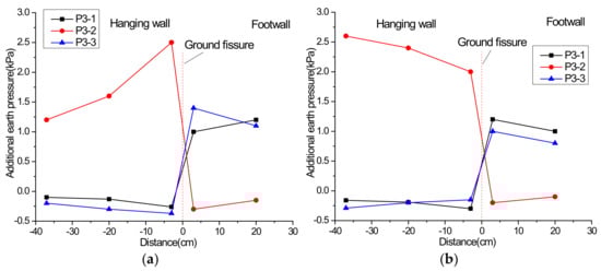 Additional earth pressure at 50 cm height under the scenario of inactive ground fissure: (a) vibration exciter at 60 cm; (b) vibration exciter at 100 cm.