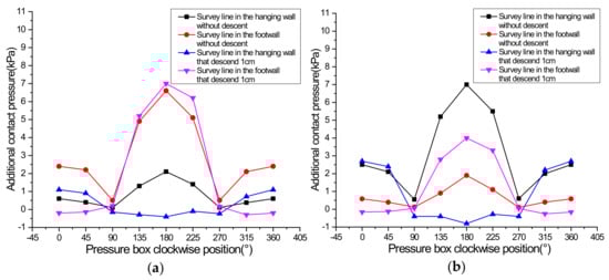 Additional earth pressure at 85 cm height under the scenario of hanging wall descending (1 cm): (a) vibration exciter at 60 cm; (b) vibration exciter at 100 cm.