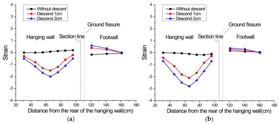 Distribution of the maximum longitudinal additional strain at the tunnel crown: (a) vibration exciter at 60 cm; (b) vibration exciter at 100 cm.