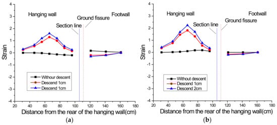 - The excitation-induced additional strain at the crown and bottom of the tunnel are approximately zero with a condition of an inactive ground fissure. When the hanging wall of the ground fissure descends from the original place, negative and positive additional strain is identified at the crown and bottom of the tunnel in the hanging wall, respectively, implying a compression state. Meanwhile, positive and negative additional strain is observed at the crown and bottom of tunnel in the footwall, respectively, implying a tensile state.