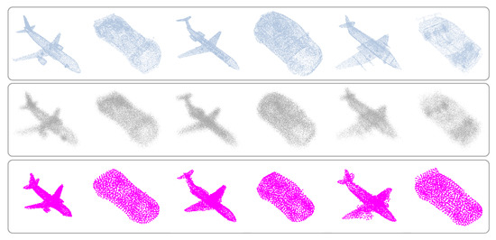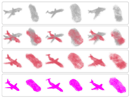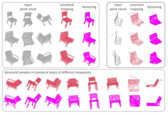 Figure 8 presents several qualitative results for . In the figure, the first row depicts rotated and noise-corrupted test input instances from the airplane and car categories. These instances were fed into CMD-Net, the canonical mapping part of which first canonicalized them. In the second row of the figure, the test inputs and canonicalization results are overlaid, and the third row depicts canonicalization only. The canonicalized inputs were then fed into the denoising part of the network, and the final results are given in the fourth row of the figure. This characteristic of CMD-Net alleviates the dependency on pre-aligned data for the denoising problem.