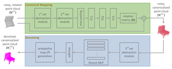 The canonical mapping part of CMD-Net is a PointNet++-based encoder–decoder architecture. Given a noise-corrupted rotated point cloud as input, the encoder represents the input with b dimensional feature vector through two SA modules (see Figure 2, the 1st and the 2nd SA modules) plus one max-pooling layer. Feeding this representation into fully-connected (FC) layers (FC1, FC2, FC3 in Figure 2), it estimates a rotation matrix that when multiplied with produces to be fed into the denoiser.