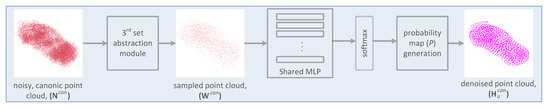 The denoising part of CMD-Net is an encoder–decoder architecture. The encoder of the denoiser represents points involved in a cloud through a PointNet++-based 3rd set abstraction (SA) module (see Figure 2). Given the noise-corrupted canonical input cloud , the module samples a new set of points (). Each point is then represented with a z dimensional feature vector , and the feature set of the sampled points is as follows: . Hence, the input of the 3rd SA module is dimensional point cloud, and its output is dimensional tensor. Note that q is less than or equal to M ().