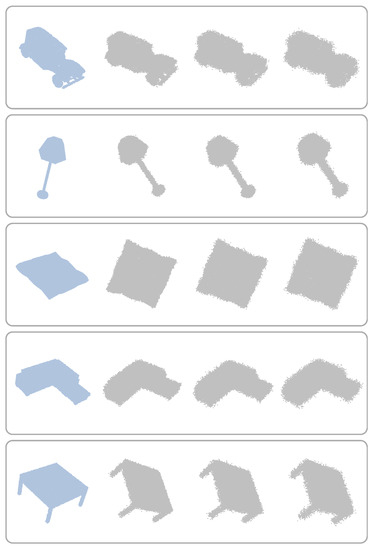 - Chang, A.X.; Funkhouser, T.; Guibas, L.; Hanrahan, P.; Huang, Q.; Li, Z.; Savarese, S.; Savva, M.; Song, S.; Su, H.; et al. ShapeNet: An Information-Rich 3D Model Repository. arXiv 2015, arXiv:1512.03012. [Google Scholar]