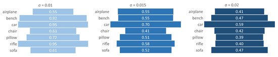 Since this is the first time we introduce the CMD-Net dataset, we present intra-class analyses. Table 2 depicts the denoising performance of our method for , , and , and noisy rows show the C2C scores of the input noise-corrupted test instances. According to the table, our method reached the lowest score on airplane, and the score of the car category was the highest for the low-level noise (). In case the test instances wase corrupted by mid-level noise (), the value of the chair category was the minimum, and pillow was the maximum. At the high-level noise (), rifle-car pair had 0.64-by-0.96 as the minimum–maximum pair of the scores. Despite giving an idea about the performance of CMD-Net, we find this analysis insufficient, since the C2C scores of the test instances involved in each category were different. Therefore, our next error analysis presents the scores of CMD-Net normalized by noisy rows of Table 2.