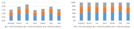 The normalized errors are presented in Figure 7, the left image of which presents the cumulative errors, while the right one indicates the weights of noise levels on the cumulative errors. On the left, we see that when the normalized errors of all noise-levels are summed up, our method performed best on the chair category, and airplane, sofa, and pillow subsequently follow. The categories of bench and rifle were relatively degraded, and the CMD-Net lowest record was on the car category. Given the right image, it is apparent that the error scores of the low-level noise had the highest weight, demonstrating that our method showed better performance as the noise-level increased.