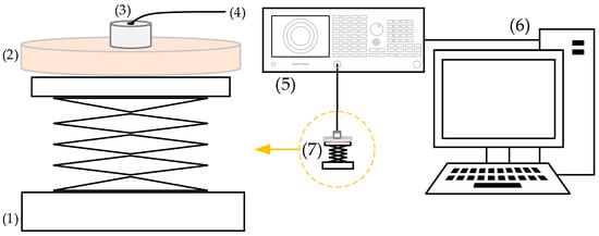 Measurement equipment (1. Laboratory jack, 2. Sample, 3. Open-ended coaxial probe, 4. Coaxial cable, 5.VNA, 6. Computer with software and 7. Measurement setup).