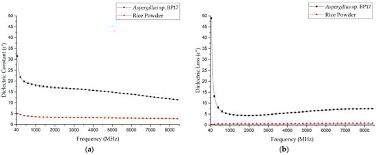 Dielectric properties of Aspergillus sp. BP17 and rice powder: (a) Dielectric constant (ε′) and (b) Dielectric loss (ε″).