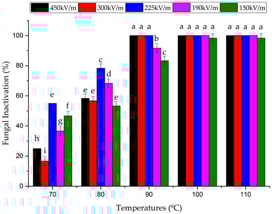 The rice samples were treated by the heating system at a selected frequency and electric field intensity of 40.68 MHz with 150, 190, 225, 300, and 450 kV/m, respectively. The fungal inactivation on the rice sample was obtained by using temperature with electric field intensity (Figure 7). As seen in Figure 7, the synergies of temperatures and electric field intensities can be divided into nine groups (a–i, which are from the highest to lowest group of the fungal inactivation). The result showed that the fungal inactivation of 100% was obtained at the electric field intensity value ≥ 225 kV/m at the lowest temperature of 90 °C. Based on statistical analysis, the fungal inactivation in rice grains was significant (p ≤ 0.05) by the effects of the combination of temperature and electric field intensity. A previous study reported that the effect of both the thermal and non-thermal was caused by the pasteurization mechanism on micro-organisms at the cellular level [54]. Here, the fungal inactivation of 100% was obtained using 190 kV/m at 100 and 110 °C, 225 kV/m at 90, 100 and 110 °C, 300 k V/m at 90, 100 and 110 °C, 450 kV/m at 90, 100 and 110 °C (Figure 7). The effect of different temperatures on fungal inhibition has been reported including Aspergillus sp. in canned strawberries (94 °C) [55] and grape juice (85 °C) [56], Aspergillus niger (90 °C) and Aspergillus flavus in oil seed (90 °C) [19], Aspergillus flavus in Khao Dawk Mali 105 (90 °C) [57], and the other Aspergillus species with a neosartorya-morph (80–90 °C) [58].