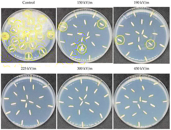 To visualize the effect of dielectric heating on fungal growth based on different electric intensities, six samples including one non-treated sample (control) and five treated samples (150, 190, 225, 300, and 450 kV/m ) were selected to show fungal inactivation. Figure 8 shows the fungal growth on PDA after rice samples were treated with different electric intensities at 90 °C. Fungal mycelium was grown from rice grains in the control agar plate. On the contrary, fungal growth from rice grains was deceased based on 150 k V/m and 190 kV/m, and the hyphae were not germinated from rice grains that were treated with electric field intensity value ≥ 225 kV/m at 90 °C. This indicates that the optimal conditions of dielectric heating (combination of 225 kV/m and 90 °C) are powerful for fungal inactivation in rice grains by dielectric heating. Cain reported that the electric field (194 kV/m) has a non-thermal effect on the cellular membrane (in the air of electrode gaps) [59]. Use of both thermal and non-thermal mechanisms was reported in Aspergillus fumigatus and Neosartorya fischeri in apple juice (83 and 92 °C with 20 V/cm, 83 °C with 27 V/cm, and 90 °C with 9 V/cm) [60,61] and Aspergillus niger in tomato (89 °C with 36 V/cm) [62].