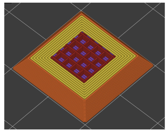 Exemplary illustration of a slice through the tool paths and naming conventions for sample 2 shown in PrusaSlicer software, 8 outer walls in red/orange for the outermost wall, purple for the solid bottom layer and red the hatched infill every 4 µm. The shown sliced pyramid is scaled by a fourth.