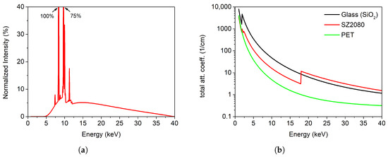 (a) X-ray spectrum of the used setup calculated with aRTist (parameters see Section 2.4). Note that most photons are created in the low-energy range around 10 kV (characteristic lines of tungsten) and at the mean energy of the bremsstrahlung at around 15 kV. (b) Total linear attenuation coefficients of glass (SiO2, ), SZ2080 (C36H68O20Si4Zr, ) and PET (C10H8O4, ).
