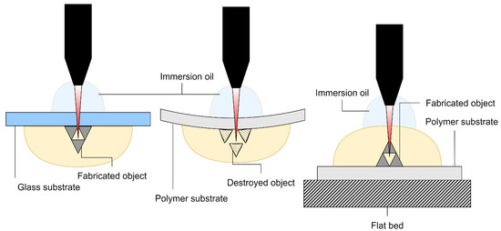 When exchanging the standard glass substrate by a PET-polymer substrate, a modification of the DLW fabrication process is needed, as illustrated in Figure 6. The mechanical properties of glass and polymer are very different. For instance, polymer easily bends under load of the optical system (oil and objective). The common DLW fabrication approach through the substrate, where oil is applied on top of the substrate and pre-baked SZ2080 is applied underneath (structure is built under the substrate), cannot be applied here. Instead of this, the immersion oil was directly applied on the pre-baked SZ2080 droplet on top of the PET-polymer substrate, and the structure was built “on top of the substrate”. Note that the PET-substrate was mechanically stabilised by another glass slide from the bottom. A disadvantage of this setup is that the immersion oil dissolves the photoresist at a slow rate of an estimated 0.01 mm/h and thus, fast fabrication is advised.