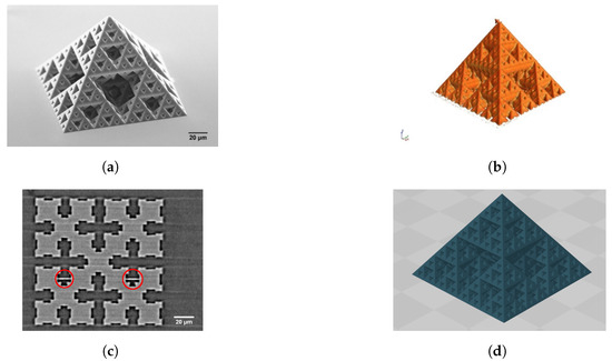 With a total height of 100 µm, the next smaller resulting triangle height was 50 µm, 25 µm, 12.5 µm and 6.25 µm, respectively. Calculation of the surface area as well as volume of the octahedron fractal pyramid according to the recursion depth can be performed using formulas taken from Zeitler [48]. For explanatory and illustration purposes, a 3D model with a cut in the X- and Y-plane is shown in Figure 2.