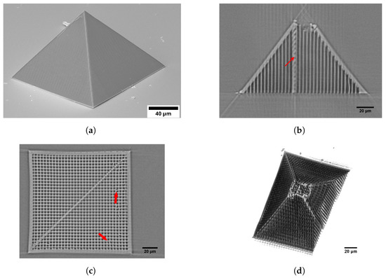 In Figure 8b, a horizontal and in Figure 8c, a vertical cross section of such a structure can be seen. The top of the fabricated pyramid shows a missing tip, see Figure 8d. The infill consists of individual lines (walls) that were produced as a single DLW-voxel line. Detection of internal (hidden) voxel-sized structures is possible to visualise with XCT. In addition to the missing tip, various internal defects were found by XCT (as highlighted in Figure 8b,c), for instance, bending of the infill and unintended polymerised regions. With the ability to individually slice an XCT-measured structure, the size and shape of such deformations can be quantified. We assume that the bending stems from the capillary forces that occurred during the development of the structure. The unintended polymerised region in the diagonal direction of the pyramid’s base stems from misinterpretations of the used slicing code. With further tuning of the fabrication parameters and decreasing the beam velocity, it was possible to obtain consistent results with entirely fabricated tips. This detailed XCT analysis demonstrates that not only the beam velocity and laser power play a role in successful fabrication, but also the slicing software. XCT proved to be a valuable analysis technique for DLW-fabricated structures. XCT was able to individually determine the origin of different flaws in the fabrication procedure by displaying them, which enables the operator to find an individual solution for the missing tip and the misinterpreted lines in the slicing code. Therefore, XCT is a highly useful tool for the process feedback of DLW-produced structures on the micro- and nanometer scale.