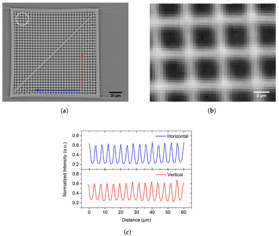 (a) Horizontal slice through the structure, the blue and red arrows mark a line measurement; (b) Zoom-in of high-resolution image area corresponding to the white circle in (a). Square-like areas of the same gray value correspond to a cut of a voxel with a nominal size of 0.33 × 0.33 × 0.33 µm3. (Voxels appear in a non-regular grid, as the original voxel grid of the scan and virtual grid of the scanned object do not match. The sample was slightly tilted during the scan. However, the image was aligned to the object’s grid, therefore, the voxel grid appears to be tilted in the print-out); (c) Normalised intensity along the blue and red arrow shows clear detectability of multiple single voxel walls.
