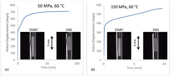 Photographic images of KDP samples at early and late stage CSP with (a) 50 MPa uniaxial compression at 60 °C; (b) 150 MPa at 60 °C. Additionally, plotted are piston displacements versus cold sintering time for each CSP condition (1 mm displacement ≈ 500 piston steps).