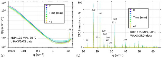 (a) In situ slit-smeared USAXS/SAXS line-trace data versus q for KDP CSP using p = 125 MPa at 60 °C. Point-to-point data uncertainties are indicated by scatter in the line traces. (b) Corresponding in situ WAXS (XRD) data with selected XRD peaks indexed.