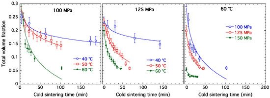 Figure 4 presents the variation with cold sintering time of the combined volume fractions of the lognormal pore components representing the macroscopic coarse pores separating powder grains and the separate population of nanoscale pores near triple-point contacts, etc. (populations (i) and (ii) defined above). As indicated below, this total porosity is dominated by the macroscopic pores, which represent more than 98% of the pore volume. The rate and degree of reduction in total porosity (densification) is clearly a function of both temperature and compressive pressure, p. At 40 °C, loss of porosity and densification by CSP is only partially effective with either p = 100 MPa or p = 125 MPa. At 50 °C, this is still the case for p = 100 MPa, but densification is significantly more effective with p = 125 MPa applied compression. At 60 °C, densification appears to be effective at all 3 compressive stresses: p = 100 MPa, 125 MPa, and 150 MPa. (Additionally, see Figure 1) Indeed, densification at 60 °C for p = 150 MPa seems too fast to be captured properly with the real-time resolution of these experiments.