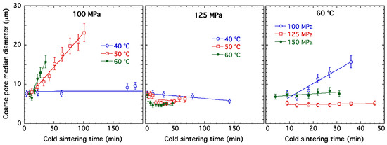 Figure 5 presents the variation in coarse pore (macropore) median diameter versus cold sintering time. It should be emphasized that these median diameters have been derived from the lognormal size distributions for the coarse pore component fitted to the scattering data. Diameters greater than ≈10 μm imply some significant extrapolation beyond the maximum size that can be measured directly from USAXS data but do emerge from the model fitting. Nevertheless, these variations of the derived coarse pore median diameter with cold sintering time can be used as a measure of how the representative pore diameter changes during CSP. (The median diameter is used because it is at least smaller than the mean diameter.) Note that coarsening of the median or mean pore diameter does not necessarily mean that individual pores become coarser, but more likely implies the loss of finer pores from the distribution due to sintering (and of course the porosities do decrease during sintering). Nevertheless, it is reasonable to associate the mean size of the remaining pores with the mean grain size. In this connection, it is noted that CSP with p = 125 MPa or 150 MPa produces no significant coarsening of the pore size distribution. With p = 100 MPa, significant coarsening of the median pore diameter is indicated at 50 °C and even more so at 60 °C, but there is no coarsening at 40 °C. Comparison of Figure 5 with Figure 4 indicates that significant loss of porosity and densification occurs in all cases (even if not always fully effective as discussed above). While globular pores have been assumed here for convenience, CSP, like other sintering processes [13,24], seems to cause large pores to flatten and become more oblate with their larger dimensions remaining representative of neighboring grain sizes that may or may not coarsen during sintering. The progressive flattening of the pore shape implies a reduction in pore volume, and hence densification of the sample. With KDP, there appears to be grain coarsening at higher temperatures (50 °C, 60 °C) for a lower compression (p = 100 MPa).