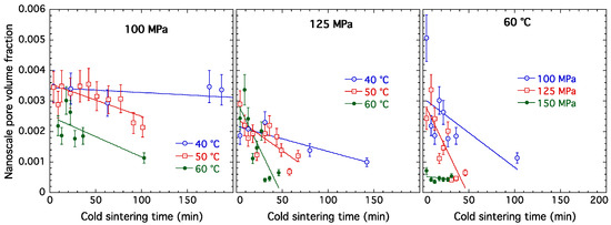 Nanoscale pore volume fraction versus cold sintering time for 40 °C, 50 °C, 60 °C with p = 100 MPa and 125 MPa, and for p = 100 MPa, 125 MPa, 150 MPa at 60 °C. Straight-line fits are guides to the eye.