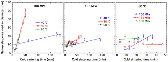 Nanoscale pore median diameter versus cold sintering time for 40 °C, 50 °C, 60 °C with p = 100 MPa and 125 MPa, and for p = 100 MPa, 125 MPa, 150 MPa at 60 °C. Straight-line fits are guides to the eye. The 60 °C data for all 3 compressive stresses are plotted out to just 50 min, in this and future real-time plots to show more clearly the different variations with time.