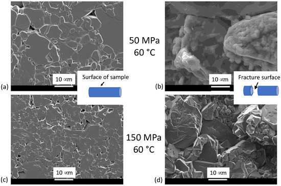 SEM micrographs of KDP samples after fracture during late-stage CSP for (a,b) p = 50 MPa at 60 °C; (c,d) p = 150 MPa at 60 °C. (a,c) show intact outer surfaces of the samples after CSP; (b,d) show the fracture surfaces.