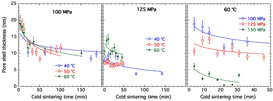 Pore shell thickness versus cold sintering time for 40 °C, 50 °C, 60 °C with p = 100 MPa and 125 MPa, and for p = 100 MPa, 125 MPa, 150 MPa at 60 °C. Logarithmic line fits are guides to the eye.