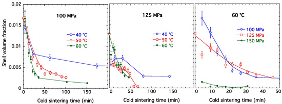 Shell volume fraction versus cold sintering time for 40 °C, 50 °C, 60 °C with p = 100 MPa and 125 MPa, and for p = 100 MPa, 125 MPa, 150 MPa at 60 °C. Lines are guide to the eye.
