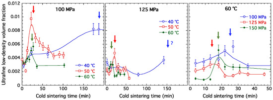 Ultrafine low-density volume fraction versus cold sintering time for 40 °C, 50 °C, 60 °C with p = 100 MPa and 125 MPa, and for p = 100 MPa, 125 MPa, 150 MPa at 60 °C. Lines are guide to the eye. Arrows indicate maxima in the volume fractions during each in situ study.