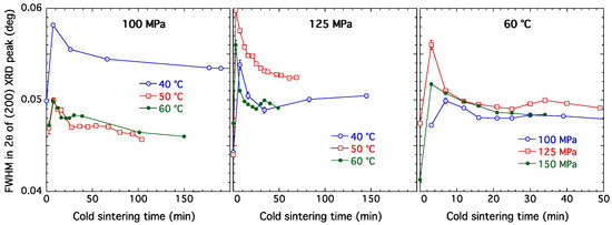 FWHM in 2θ of 200 XRD peak versus cold sintering time for 40 °C, 50 °C, 60 °C with p = 100 MPa and 125 MPa, and for p = 100 MPa, 125 MPa, 150 MPa at 60 °C. Lines are guide to the eye. Vertical bars represent the computed peak fitting standard uncertainties, and are mainly smaller than the data points, themselves.