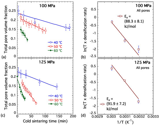 Arrhenius analyses of CSP for (a,b) p = 100 MPa; (c,d) p = 125 MPa, using data for total pore volume fraction at 40 °C, 50 °C, and 60 °C. The activation energy is with respect to loss of porosity per mole of solid KDP that fills the pore space during densification. Vertical bars are computed standard uncertainties of the straight-line fits.
