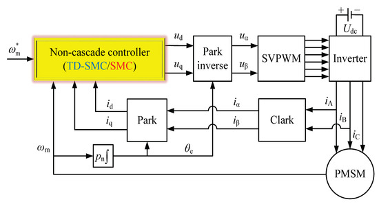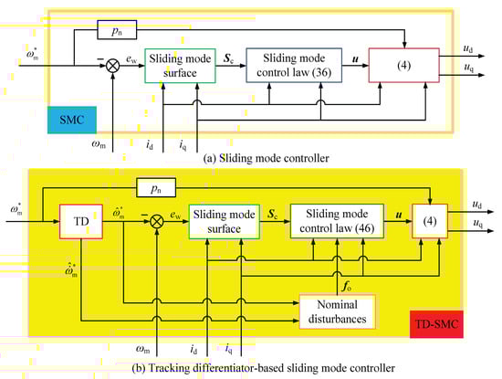 As a result, the corresponding schematic block diagrams of the different non-cascade SMC strategy for a PMSM regulation system are individually shown as Figure 1, which are distinguished with each other by using the abbreviations of “SMC” and “TD-SMC”, respectively.