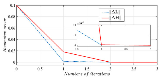 According to the algebraic Equation (21), we can easily obtain that and , resulting in the initial matrix values and , respectively, where represent the ε-dependent infinitesimal value. In addition, by employing the fixed-point recursive algorithm, one can calculate the solutions of the above formulations, which are as follows: and , where and are the iteration numbers (non-negative integers) for and , respectively.