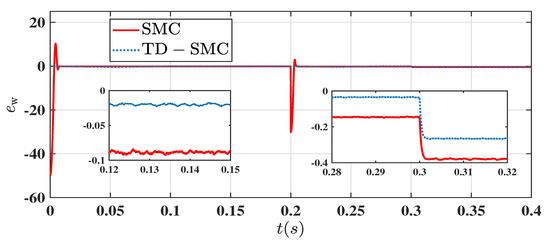 It can be concluded from Figure 6 and Figure 7 that the presented TD-SMC (46) possesses a smaller steady-state regulation error than that of SMC (36). In addition, benefitting from the constructed TD (44), the velocity response performance is characterized by no obvious overshoot. Meanwhile, by combining Figure 4 and Figure 6, it can be founded that the arranged transition dynamic has about 0.1 s time delay when the velocity factor is determined as . It is worth mentioning that, for the above-mentioned reference signal , which can be quickly and accurately tracked by the speed regulation system under the proposed TD-SMC strategy. In summary, the satisfactory system performance can be guaranteed based on the presented approach.