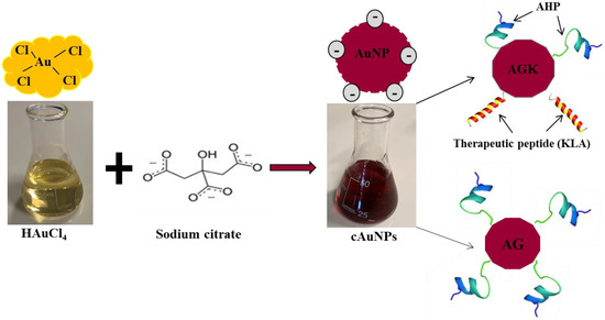 Chemical synthesis and bio-functionalization of AuNPs with AHP (AG), and both AHP and KLA (AGK) peptides.