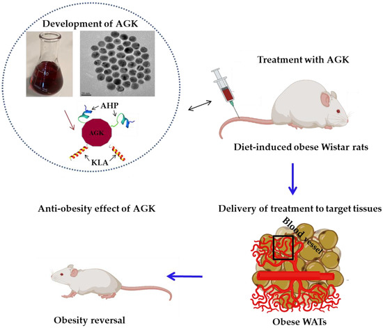 The bio-distribution and anti-obesity effects of AGK following the mechanism described in Figure 3 have been further evaluated in diet-induced obese Wistar rats after 4 weeks of treatment (manuscript in preparation). Great strides have been taken throughout the world to develop targeted nanotechnology-based treatments for obesity, where nanocarriers were used as drug-delivery vehicles to improve the pharmacokinetics and pharmacodynamics of anti-obesity treatments [10,24]. As experts in this area, the BRN recently published an extensive review of the three PHB-targeting strategies for the treatment of obesity [7]. These three nanotechnology-based strategies showed exciting outcomes by (1) inhibiting angiogenesis in the WAT vasculature of obese rodents [24,27], (2) browning of WATs [15,29], and (3) the induction of photothermal lipolysis of WATs using gold nanorods (AuNRs) and gold nanospheres (AuNSs) [16]. This is exciting because the nanotechnology-based strategies, which are well established in cancer treatment, also present the possibility of their use in the reversal of obesity [7].